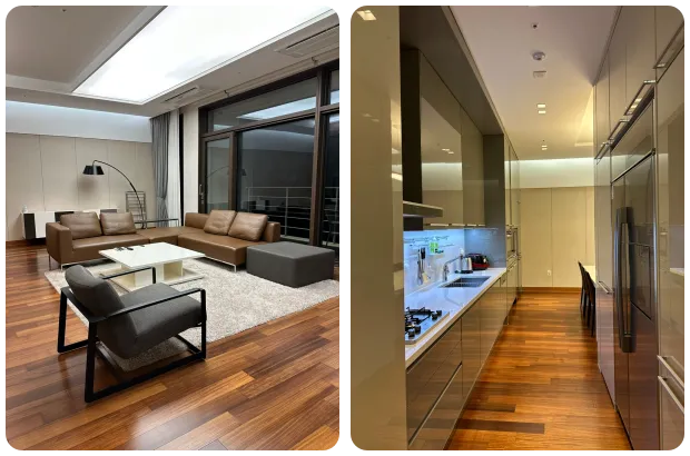 주방은 빌트인 냉장고2개, 와인바, 식기세척기,세탁기가 있고 방과 거실에 TV 가 다 비치 되어 있고 OTT가능하다.